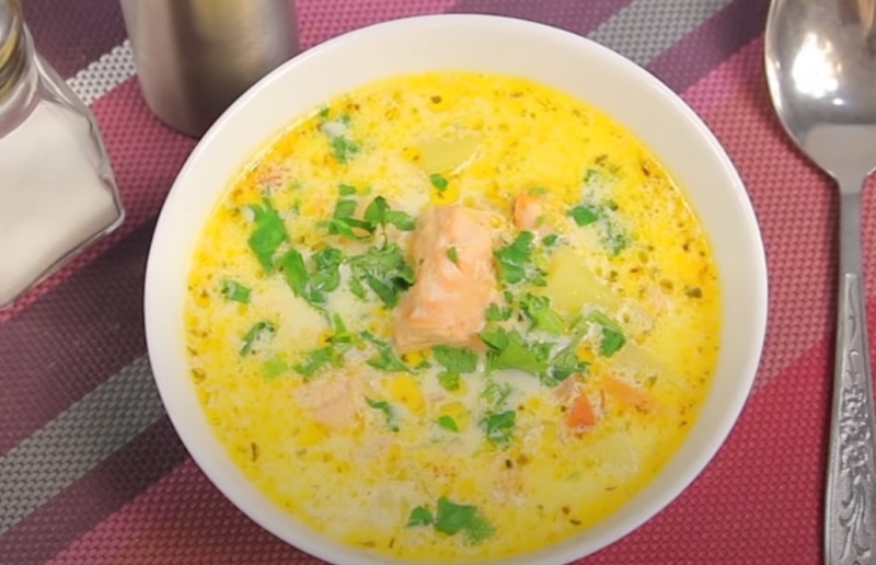 Duś przez 15 minut, a następnie włóż do garnka średniej wielkości, pokrojonego na kawałki łososia lub inną czerwoną rybę. Zagotuj zupę i dodaj suszone lub świeże posiekane zioła.