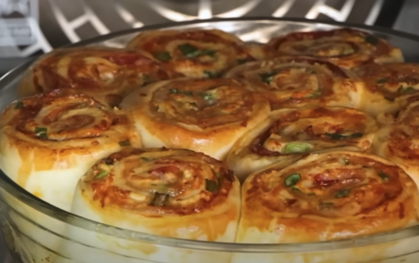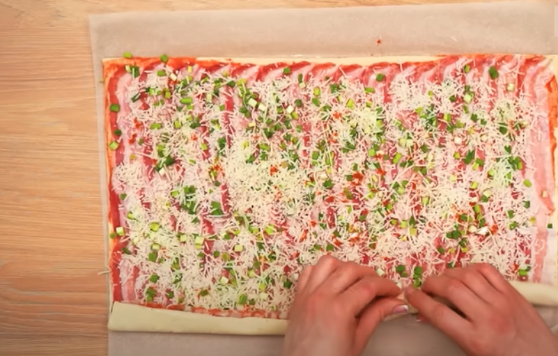 Rozwałkuj ciasto francuskie na płaskiej powierzchni. Rozsmaruj 100 g sosu pomidorowego równomiernie na powierzchni ciasta francuskiego. Pokrój 200 g boczku na małe kawałki i rozłóż równomiernie na sosie pomidorowym. Posiekaj 100 g zielonej cebuli i dodaj na ciasto. Zetrzyj 100 g parmezanu i posyp nim całość.