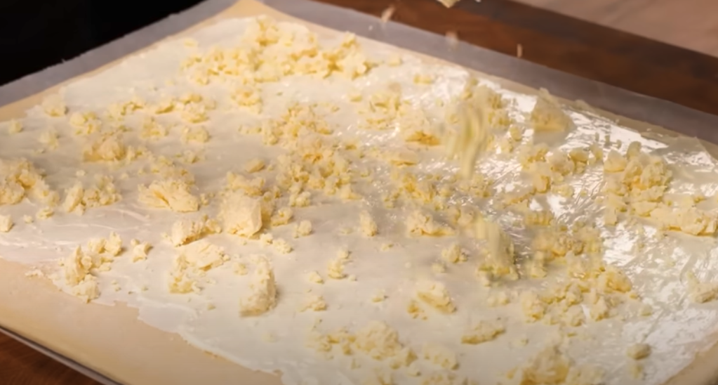 W misce wymieszaj 200 g śmietanki serowej, 15 g posiekanego czosnku, 80 g pokruszonej fety, 100 g startego sera i 15 g posiekanej pietruszki. Rozwałkuj ciasto francuskie na prostokąt o grubości około 0,5 cm. Nałóż równomiernie przygotowane nadzienie na ciasto. Zwiń ciasto w rulon i pokrój na plastry o grubości około 2 cm.