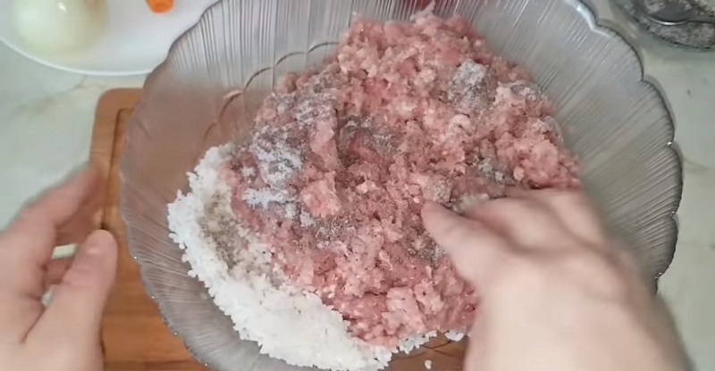Gdy liście stygną, czas przygotować nadzienie. Ryż zalej wrzącą wodą i dokładnie opłukaj ( możesz ugotować go też wcześniej na półtwardo). Dodaj mielone mięso do ryżu.