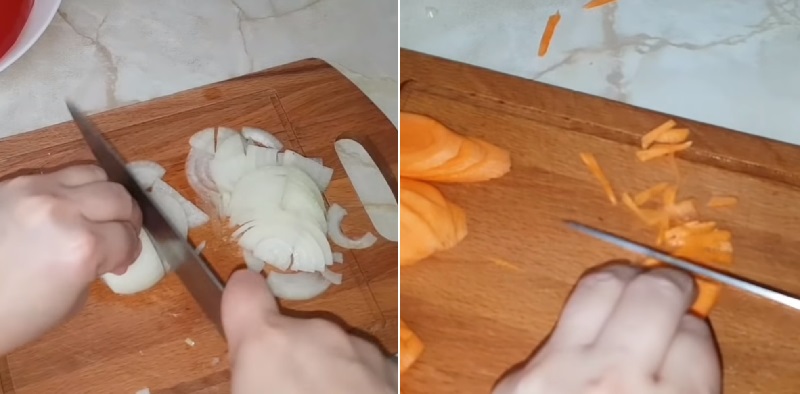 Posól i popieprz składniki i wymieszaj. Teraz czas na warzywa. Drobno posiekaj cebulę i marchewkę i usmaż na patelni z dodatkiem oleju roślinnego. Smaż przez 5–7 minut, a następnie dodaj drobno posiekaną paprykę.