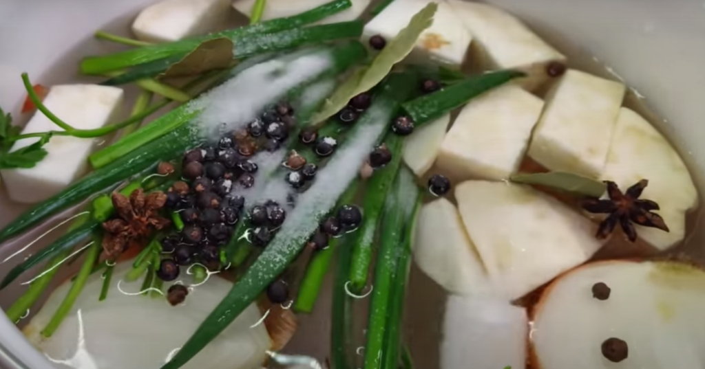 Do garnka wlej wodę, umyj cebulę ze skórką, pokrojoną na 4 części. Dodajemy również oczyszczoną marchew, seler, pietruszkę, dymkę, przyprawy, anyż, liść laurowy, sól i gotujemy na kuchence.