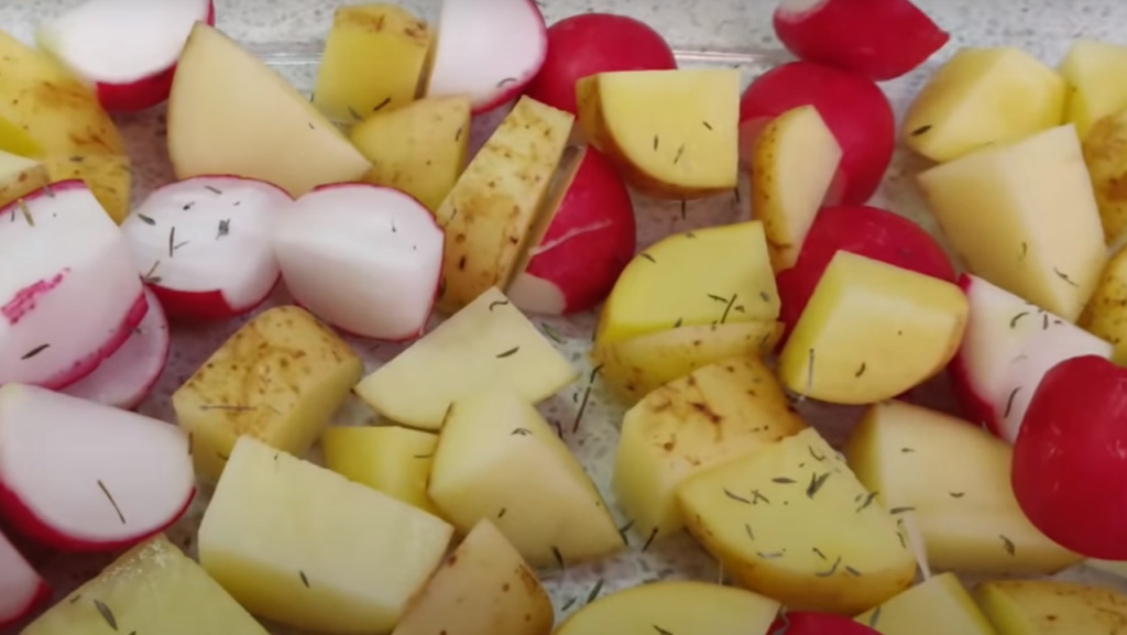 Ziemniaki z rzodkiewką wyjąć z piekarnika, wymieszać z posiekanymi pomidorami , posolić i doprawić, dodać tymianek i skropić odrobiną oliwy z oliwek. Posyp posiekanym szczypiorkiem.