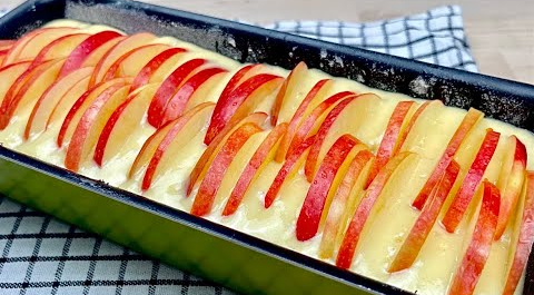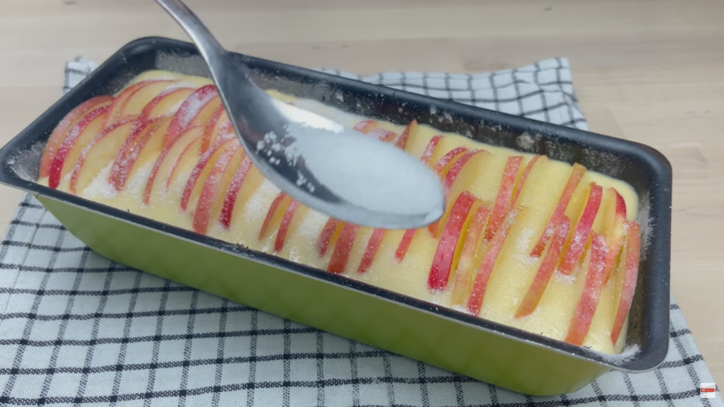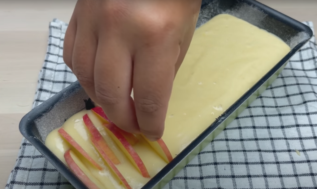 Formę do pieczenia posmaruj masłem i posyp mąką. Następnie wlej do niego przygotowane ciasto i ułóż na wierzchu plasterki jabłka.