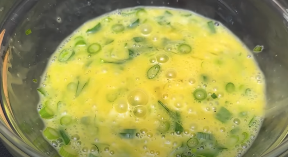 W misce rozbij 3 jajka. Dodaj posiekaną dymkę, sól, czarny pieprz i suszony czosnek. Dobrze wymieszaj. Dodaj 1 łyżkę kwaśnej śmietany i ponownie dobrze wymieszaj. Pokrój pomidora w plasterki. Rozgrzej patelnię na średnio-małym ogniu i dodaj 1 łyżkę niesolonego masła.