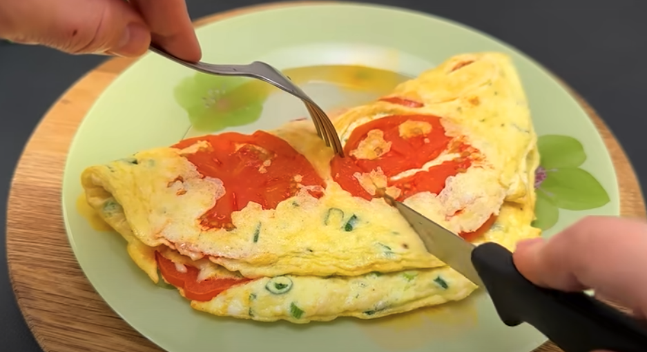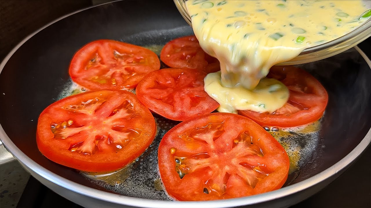 Połóż plasterki pomidora na patelni i posól. Wlej mieszankę jajeczną na patelnię i dodaj ser do smaku. Przykryj patelnię pokrywką i gotuj przez 3-5 minut, aż jajka będą gotowe. Podawaj gorące, prosto z patelni. Smacznego!