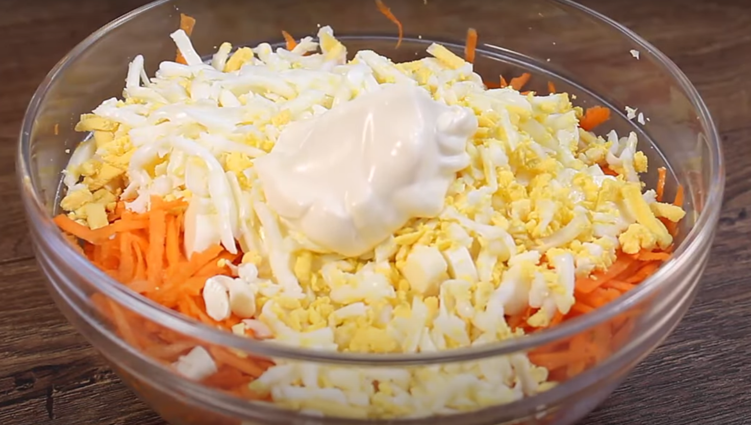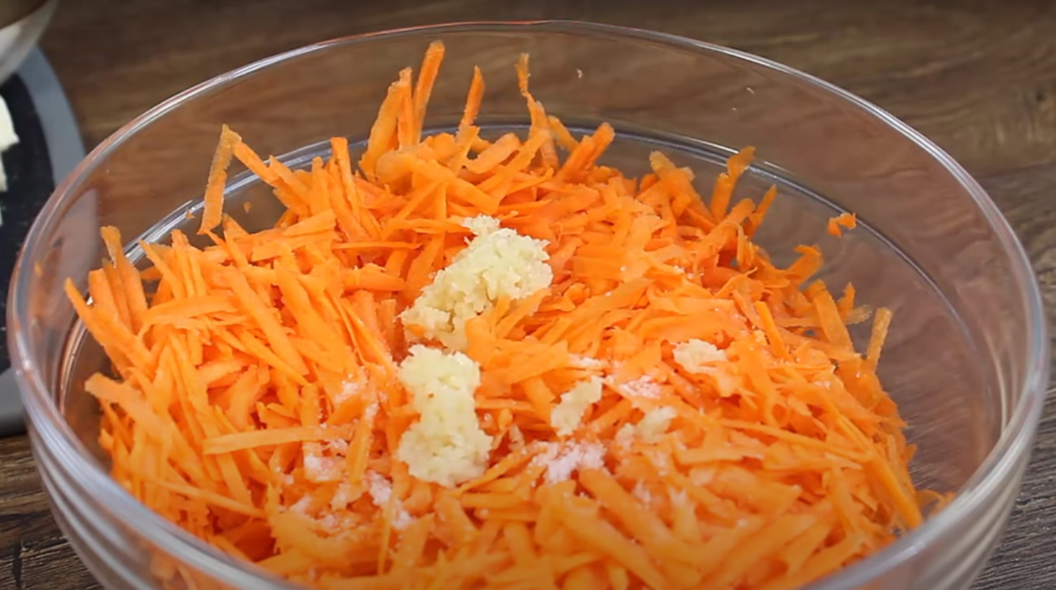 W pierwszej kolejności należy ugotować jajka na twardo, ostudzić je, a następnie obrać. Później należy obrać marchewkę i zetrzeć ją na dużych oczkach za pomocą tarki. Marchewkę wkładamy do miski i dodajemy do niej przeciśnięty przez praskę czosnek.
