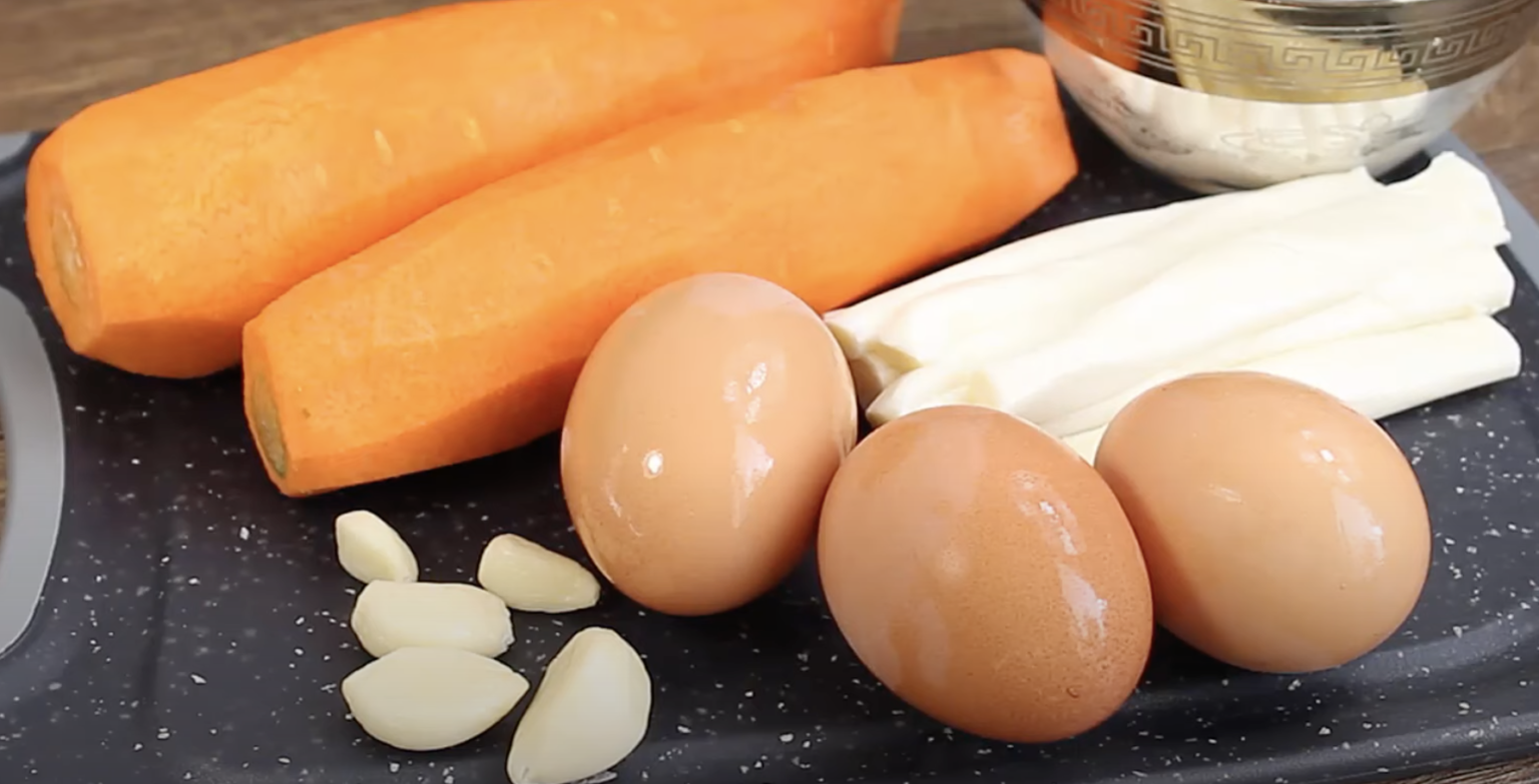W pierwszej kolejności należy ugotować jajka na twardo, ostudzić je, a następnie obrać. Później należy obrać marchewkę i zetrzeć ją na dużych oczkach za pomocą tarki. Marchewkę wkładamy do miski i dodajemy do niej przeciśnięty przez praskę czosnek.