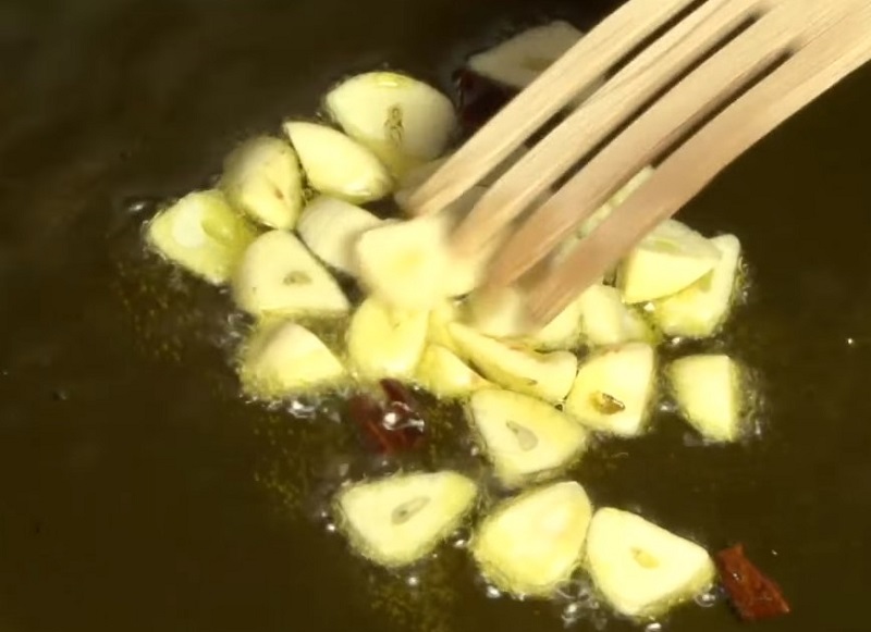 Następnie wlewamy oliwę z oliwek na patelnie tak aby zakryć dno i podgrzewamy. Do rozgrzanego tłuszczu wkładamy paprykę z czosnkiem na około 1 minutę smażenia.
