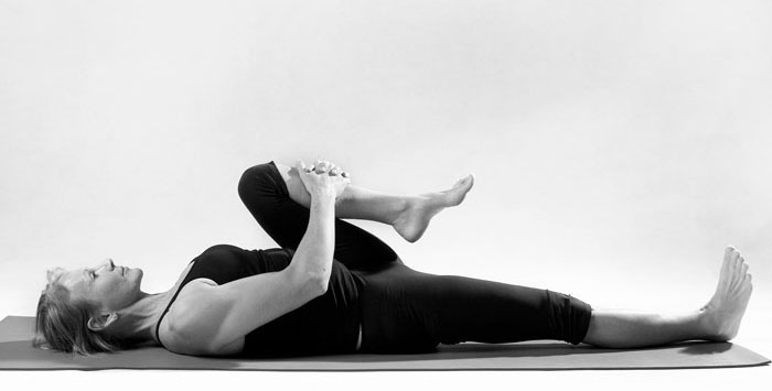 Ćwiczenie 2 zacznij od położenia się na podłodze. Jedną nogę połóż prosto na ziemi, a drugą przyciągnij do siebie, tak, aby kolano znajdowało się jak najbliżej klatki piersiowej. Pamiętaj, że przyciągając kolano, ramiona powinny przylegać do ziemi.