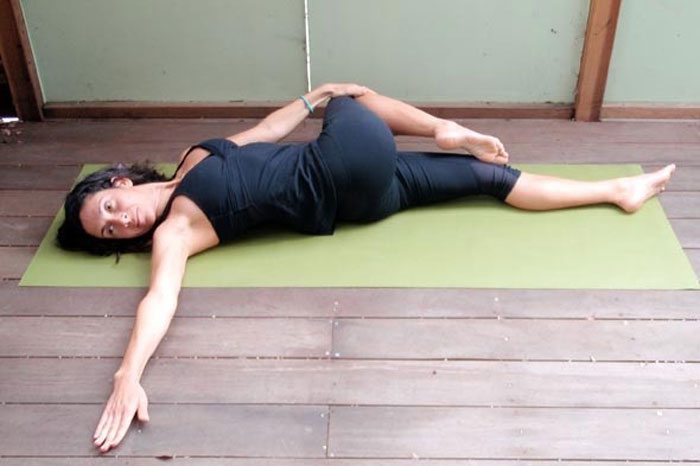 Ćwiczenie 4 polega na skręceniu ciała w pozycji leżącej. Leżąc na plecach, wyciągnij nogę i zegnij kolano pod kątek prostym. Druga ręka niech odciągnie w bok lekko kolano. Twarz i górną część ciała odwróć tak, aby widzieć rękę, która znajduje się na podłodze. Aby pozycja była prawidłowo wykonana, obydwa ramiona powinny przylegać do podłogi.