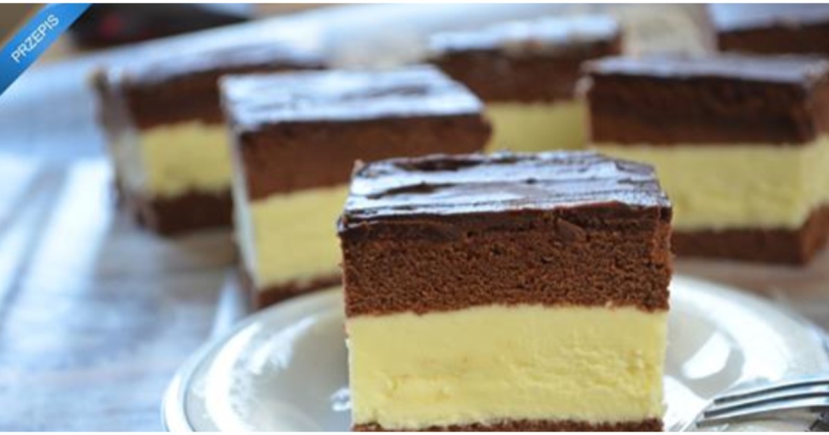 Kiedy wszystko się ładnie połączy – nasz krem będzie gotowy. Aby złożyć nasze ciasto, w pierwszej kolejności należy przekroić biszkopt na pół. Na dolny biszkopt wykładamy cały krem dokładnie wyrównując. Na krem wykładamy drugi biszkopt i przechodzimy do wykonania polewy.