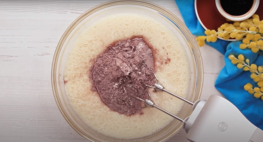 Wbij wszystkie jajka do miski, dodaj cukier i ubij. Wlej mleko i wymieszaj mąkę z kakao i proszkiem do pieczenia w osobnej misce. Dodawaj porcjami sypkie składniki do jajek.