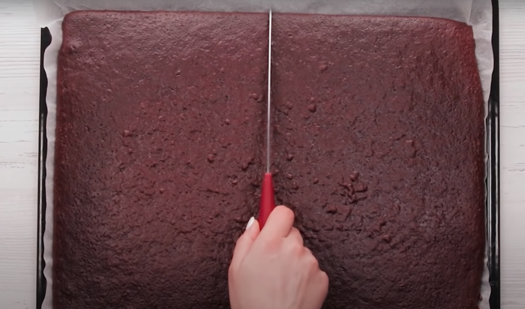 Masę wylej na blachę wyłożoną papierem do pieczenia i piecz w nagrzanym piekarniku przez 25 minut w temperaturze 180°C. Upieczone ciasto przekrój na pół.