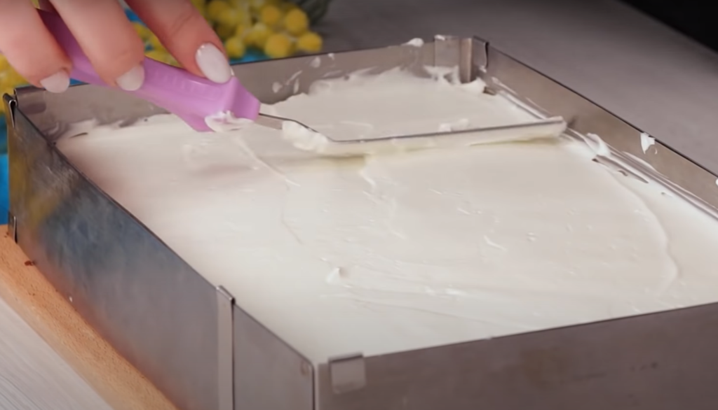 Umieść jeden kawałek ciasta na dnie mniejszej foremki i przystąp do przygotowania kremu. Miękki twarożek wymieszaj z cukrem pudrem, mlekiem, cukrem waniliowym i sokiem z cytryny. Dodawaj porcjami śmietanę. Połowę powstałego kremu ułóż na przygotowanym cieście i rozprowadź równomiernie na jego powierzchni.