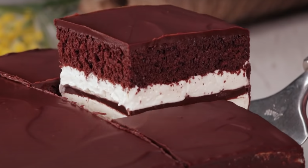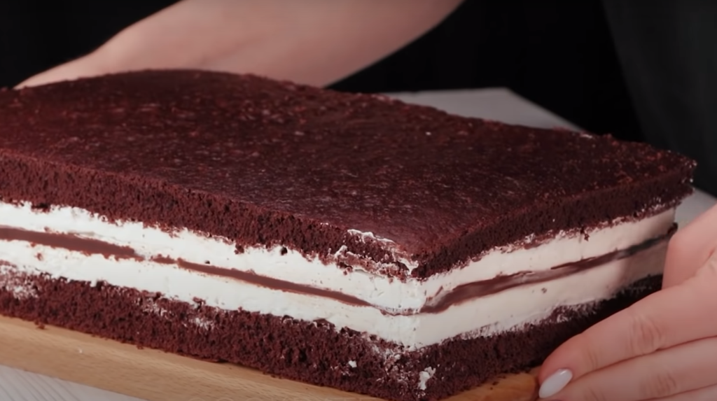 Wstaw do lodówki na 30 minut, a w międzyczasie przygotuj polewę czekoladową. Połamaną czekoladę przełóż do miski, dodaj masło, wlej śmietaną i wymieszaj w kąpieli wodnej, aby utworzyć jednolitą masę. Górę deseru polej połową lukru, wygładź i włóż do lodówki na 30 minut. Następnie nałóż na deser pozostałą resztę kremu, przykryj drugim ciastem i wstaw z powrotem do lodówki na 30 minut.