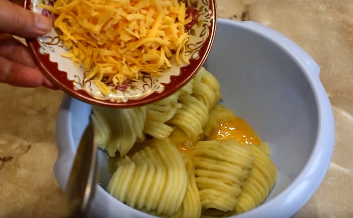 Gdy będziemy już mieli to gotowe, to przystąpmy po kolei do umycia, obrania i pokrojenia naszej cebuli w kostkę. Dodajmy do miski z ziemniakami koniecznie jajko, dobrze i dokładnie starty ser i cebulę.