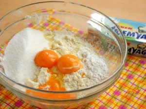 Następnie dodaj żółtka, cukier i proszek do pieczenia.