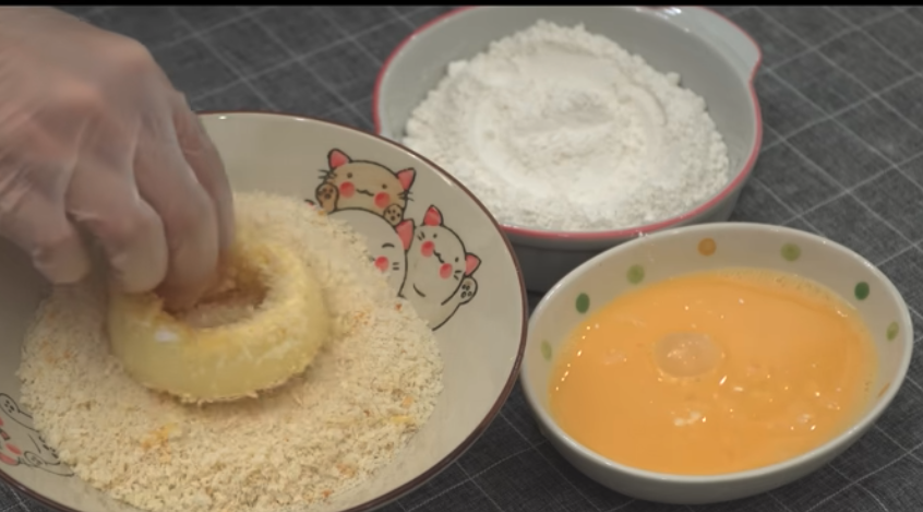 Obtocz każdy krążek w mące, następnie zanurz w jajkach, a na końcu obtocz w bułce tartej. Rozgrzej olej do średniej temperatury na patelni. Smaż krążki serowe na średnim ogniu przez 2-3 minuty, aż będą złociste i chrupiące z każdej strony.