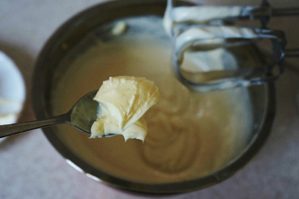 Mieszaj do momentu, aż masa zgęstnieje. Masło należy ubić dokładnie trzepaczką, połącz je ze śmietaną.