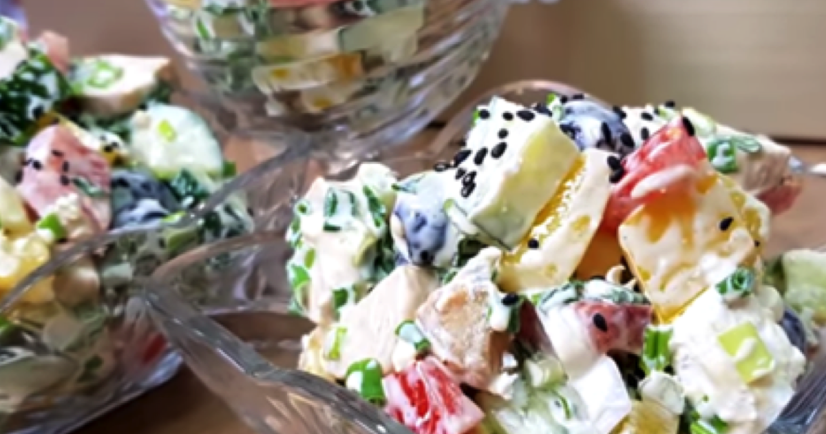Paprykę umyj i pokrój na dowolne kawałki. Pokrój ogórka na duże plastry. W pomidorach usuń rdzeń i pokrój na kawałki. Pokrój również upieczonego kurczaka na mniejsze kawałki. Przenieś wszystkie produkty do głębokiej miski sałatkowej, dodaj pokrojony ser i oliwki.