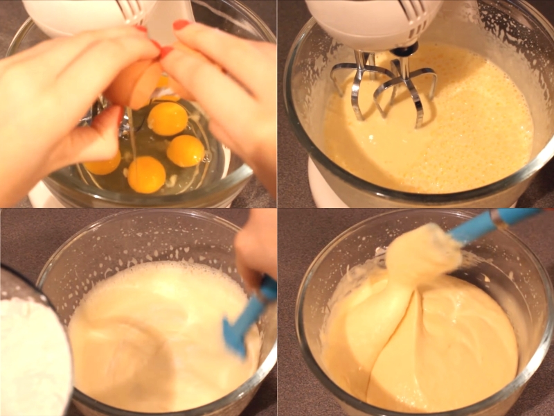 Na początku rozgrzej piekarnik do 180 stopni Celsjusza. Potem wymieszaj mąkę, skrobię ziemniaczaną oraz proszek do pieczenia. Następnie do osobnej miski rozbij jajka i ubij je mikserem, dodając gorącą wodę do czasu, aż pojawiają się bąbelki.