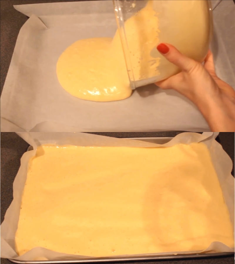 Teraz wysmaruj blachę do pieczenia masłem, nałóż papier do pieczenia i wylej na nią ciasto.