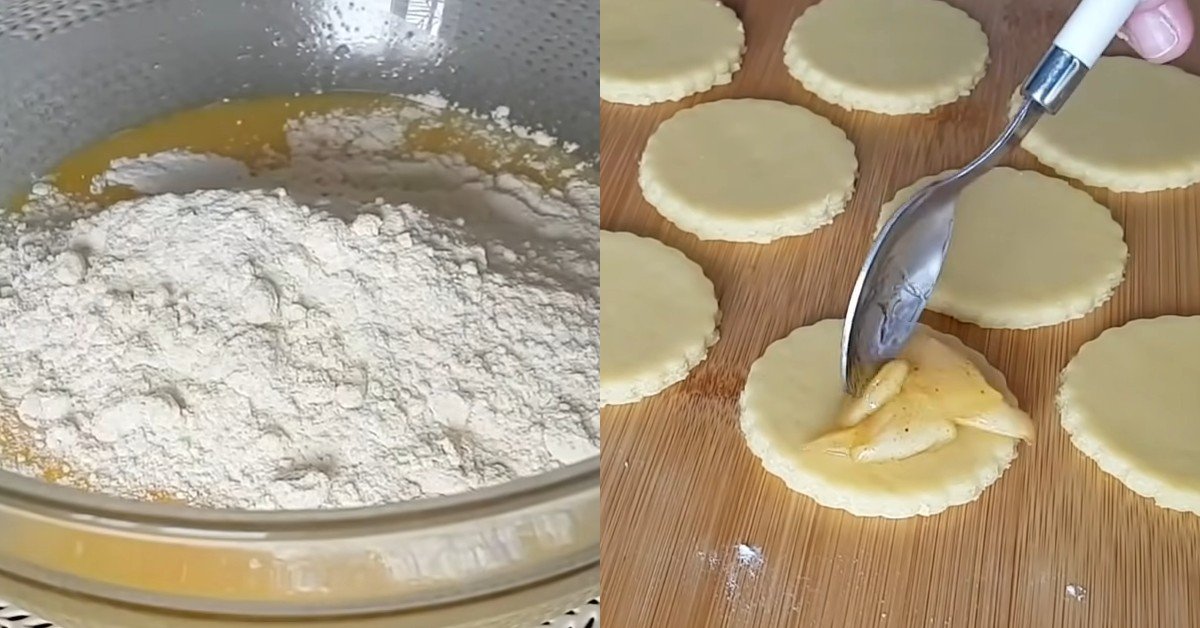 Następnie dodaj proszek do pieczenia. Wymieszaj do połączenia. Następnie stopniowo dodawaj mąkę. Wyrób gładkie ciasto, ugniatając je. Ułóż warstwę ciasta i wytnij kółka. Jest to podobne do robienia pierogów. Na każdy krąg nałóż nadzienie, a następnie złóż krążek na pół, aby powstała książka.
