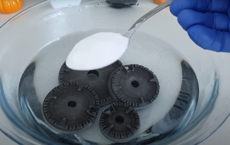 Najpierw wyjmij kratkę i palniki z pieca. Włóż palniki do garnka i zalej gorącą wodą tak, aby były całkowicie zanurzone. Dodaj łyżkę sody oczyszczonej.