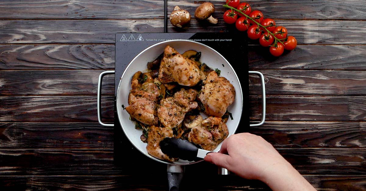 Głównymi składnikami są tymianek i rozmaryn. Tymianek dodaje grzybom niesamowitego smaku, a kurczak dobrze komponuje się z rozmarynem. Jeśli chcesz dodać pikanterii i zwiększy objętość sosu, dodaj jeszcze 100 ml wytrawnego białego wina.