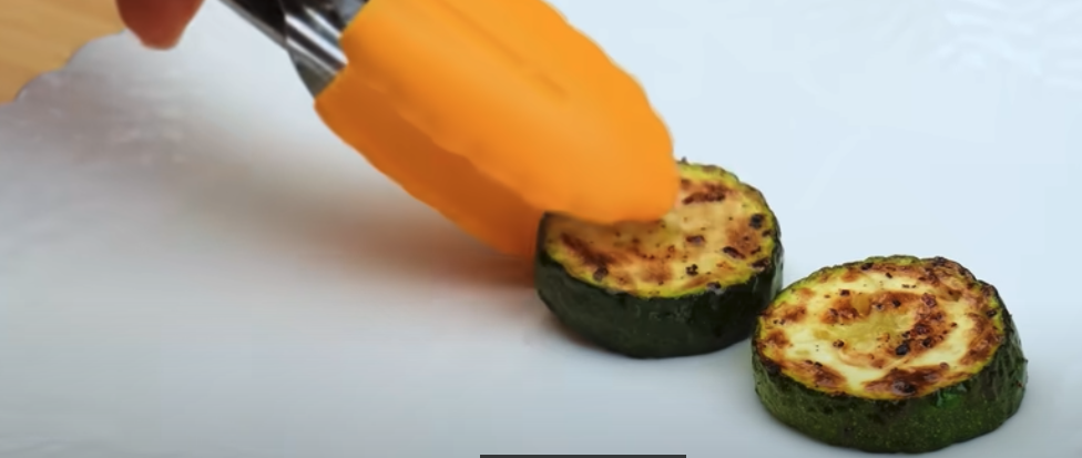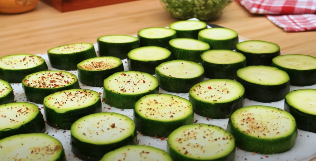 Smaż cukinię z obu stron na złoty kolor, następnie przełóż na ręcznik papierowy, aby odsączyć nadmiar tłuszczu. Zmniejsz ogień i dodaj na patelnię 1 łyżkę oliwy z oliwek. Smaż czosnek przez 20-30 sekund, aż będzie aromatyczny, ale nie zrumieniony. Ułóż usmażone krążki cukinii na talerzu. Posyp czosnkiem, koperkiem, pietruszką i mieszanką papryczek.