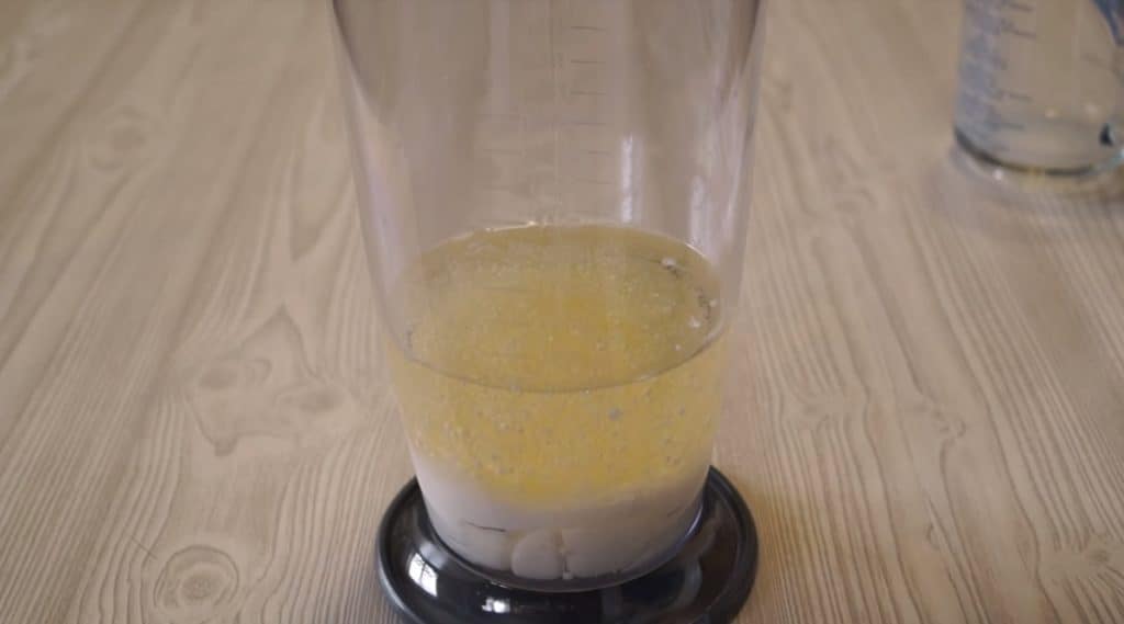 Zacznij od wlania oleju i mleka w odpowiednich proporcjach do pojemnika. Nie zapomnij, że zarówno mleko, jak i olej, muszą być w temperaturze pokojowej.