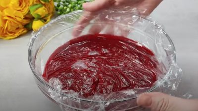 W międzyczasie rozpuść skrobię w misce z wodą i wymieszaj płyn z malinową masą na patelni. Gotuj wszystko przez 5 minut, aż zgęstnieje. Masę malinową przelać do miski, przykryć folią spożywczą i odstawić do ostygnięcia. Na wierzch konfitury malinowej nałóż folię tak, aby bezpośrednio jej dotykała. Dzięki temu nie tworzy skorupy.