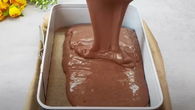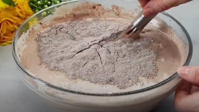 W misce ubić jajka z solą, cukrem i cukrem waniliowym. W drugiej misce wymieszaj mąkę z kakao, proszkiem do pieczenia i zmieszaj suche składniki z ubitą masą jajeczną. Aby uniknąć grudek w cieście, przesiej suche składniki.