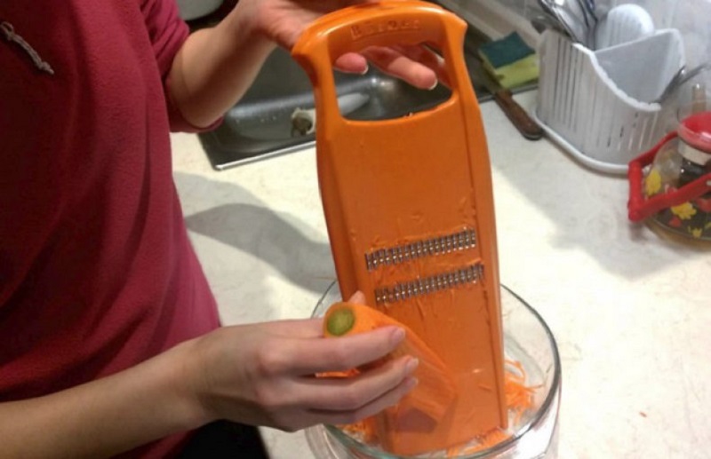 Umytą marchewkę zetrzyj na tarce. Możesz zrobić to klasycznie, jak na naszą tradycyjną surówkę, albo skorzystać ze specjalnej tarki lub obieraczki, która sprawi, że zetrzesz marchew na dłuższe paseczki tzw. julienne.