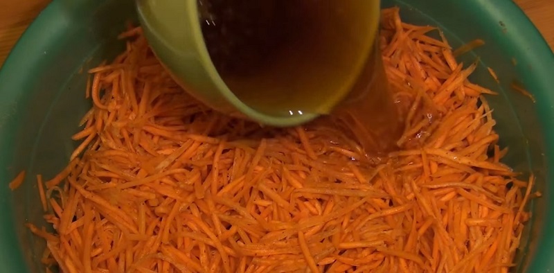 W tym czasie podgrzej lekko olej w małym garnuszku (nie doprowadzaj do zagotowania, wystarczy, że będzie przyjemnie ciepły, a nie bardzo gorący). Polej nim starte marchewki i dopraw mielonym chilli i suszoną kolendrą.