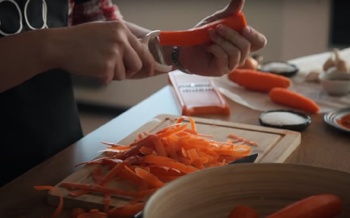 Marchewki umyj i oskrob po czym zetrzyj na specjalnej tarce. Jest to tarka do koreańskiej marchewki inaczej nazywana niszczarką.