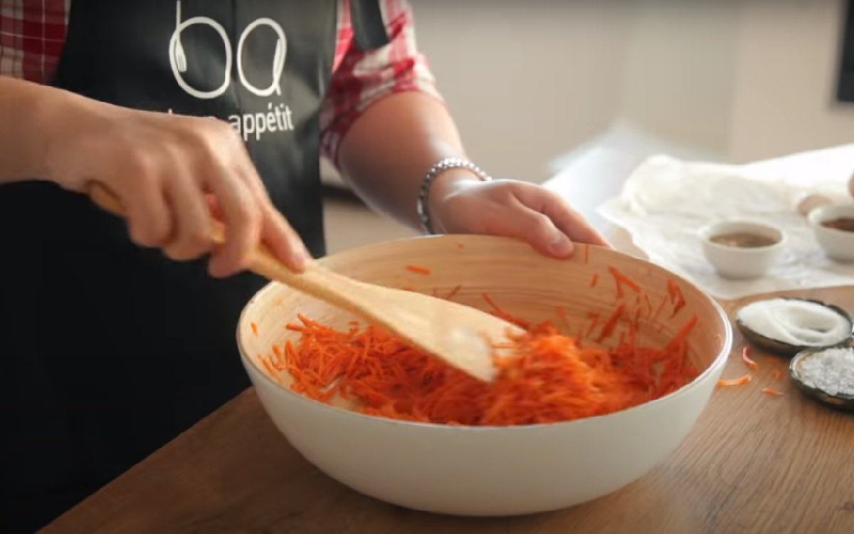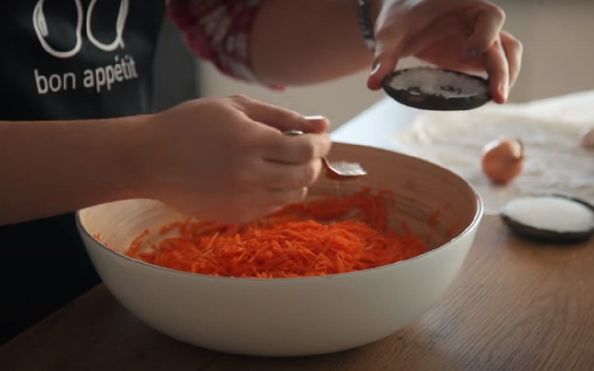 Na jeden kilogram marchewki będziesz potrzebować jednej łyżeczki soli oraz pól łyżeczki cukru. Startą marchew włóż do miski i posyp solą i cukrem.