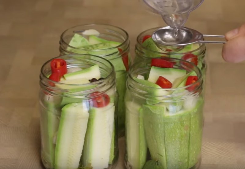 Wcześniej najlepiej, aby cukinię podzielić na ćwiartki. W każdym słoiku umieścić po gałązce koperku, ząbku czosnku, liściu porzeczki i wiśni, a także trzy ziarenka zioła angielskiego i odrobinie pokrojonej papryczce chili. Potem umieścić cukinię w słoikach, a całość zalać wrzątkiem, po czym odstawić to na około 10 minut. W średniej wielkości garnka umieścić 800 ml wody, po czym wsypać cukier oraz sól, a całość zagotować.