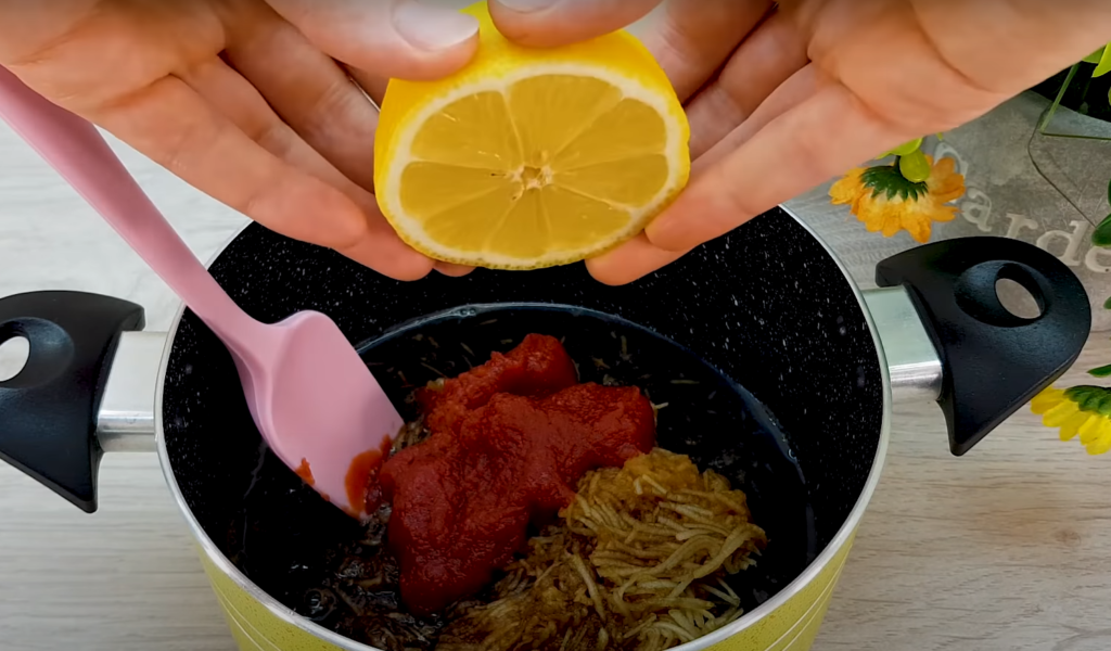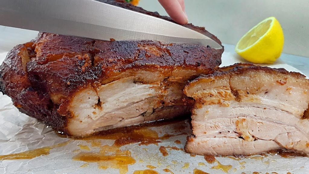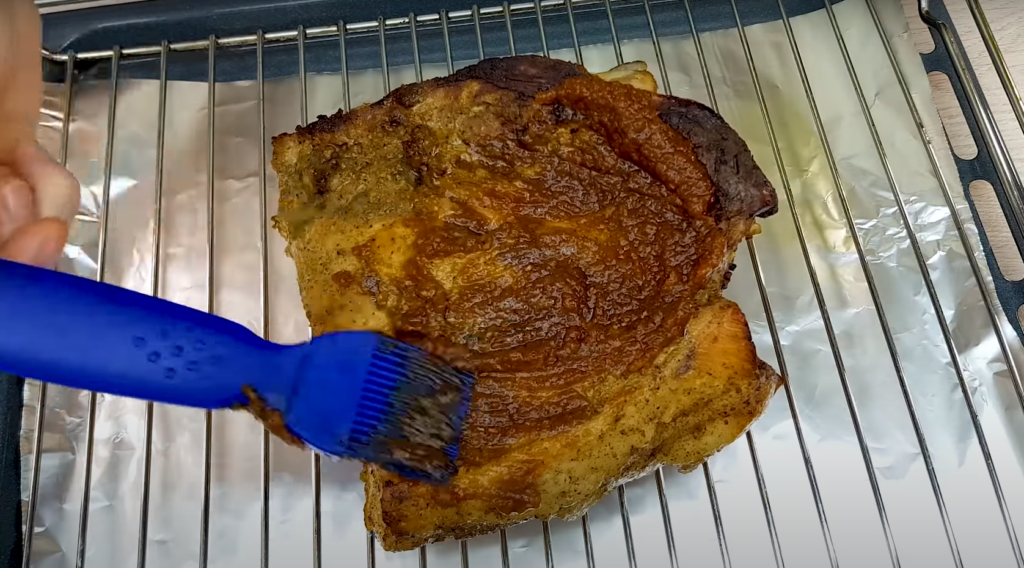 Rozgrzej piekarnik do 180°C. Zawiń mięso w folię aluminiową, wyłóż na blasze do pieczenia i włóż do nagrzanego piekarnika. Piecz przez około 2 godziny, a w międzyczasie przygotuj marynatę. Umyj jabłko i zetrzyj na tarce. Starte jabłko wymieszaj z sosem sojowym, sokiem z cytryny i koncentratem pomidorowym.