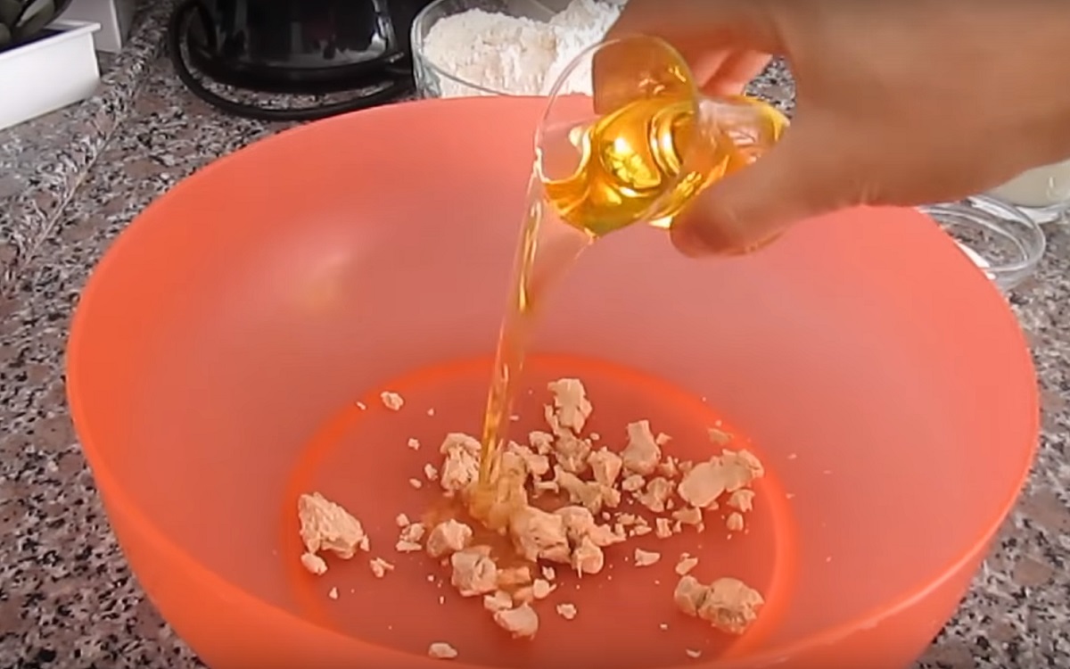 Porcję drożdży pokrusz w palcach, wrzuć do miski. Dodaj do tego sól, szklankę mleka, 150 ml oleju i wszystko razem wymieszaj.