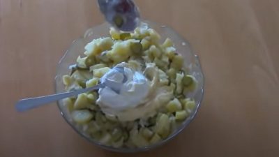 Składniki w misce doprawić solą i pieprzem i przykryć kiszonymi ogórkami. Całość mieszamy i odstawiamy na 20-30 minut do lodówki. Następnie w drugiej misce ubić żółtko, dodać musztardę i cały czas mieszając wlać olej i na koniec dodać sól. Do przygotowanej mieszanki jajecznej możesz dodać kilka kropli cytryny.