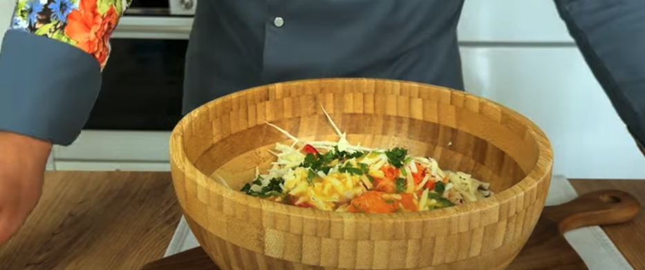 Posiekaj kapustę na drobne kawałki. Pokrój słodką paprykę w cienkie paski. Zetrzyj marchewkę na tarce. Zetrzyj ser na tarce. Posiekaj świeże zioła. W dużej misce wymieszaj kapustę, paprykę, marchewkę, ser i zioła. Dodaj 4 jajka, sól i pieprz do smaku. Dokładnie wymieszaj wszystkie składniki, aby dobrze się połączyły.