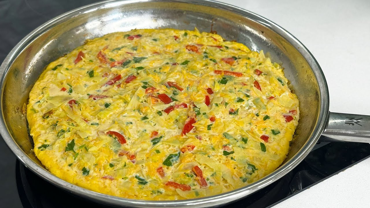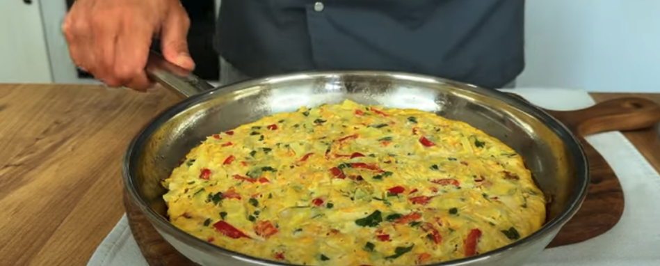 Nasmaruj patelnię olejem roślinnym i rozgrzej na średnim ogniu. Przełóż mieszankę warzywną na patelnię i równomiernie rozprowadź. Przykryj patelnię i smaż na średnim ogniu przez około 20 minut, aż spód będzie złocisty, a całość dobrze się zetnie. Po upieczeniu, podziel danie na porcje i podawaj na talerzu.