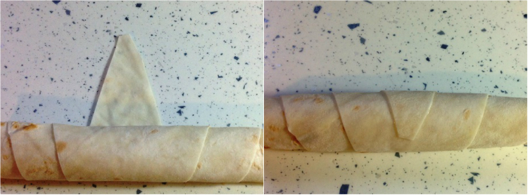 Oddziel żółtko od białka i dodaj je do nadzienia. Wszystko wymieszaj. Farsz ułóż przy szerszej krawędzi trójkąta i zwiń go rulon (końcówkę możesz posmarować białkiem z jajka aby całość lepiej się zlepiła).