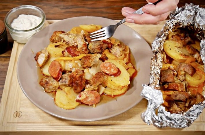 Przygotuj dwa duże prostokąty folii, ułóż je jeden na drugim i ułóż na nich połowę cebuli, ziemniaków, kiełbasek, boczku i papryki. Potem znowu ziemniaki i cebula, a na końcu połowa marynowanego mięsa. Całość doprawiamy solą do smaku i posypujemy łyżeczką słodkiego mielonego pieprzu i ewentualnie szczyptą chili. Zawiń wszystko w dwie warstwy folii aluminiowej i upewnij się, że nigdzie się nie rozerwie podczas pakowania. Powtórz tę samą procedurę z drugą połową składników.