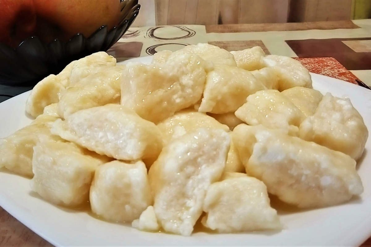 Krok 4 – Z rozłożonego ciasta odrywaj małe kawałki przy pomocy łyżki i wrzucaj je kolejno do wrzącej wody. Gdy woda ponownie się zagotuje, kontynuuj gotowanie pierogów przez 2 minuty, dopóki nie wypłyną na powierzchnię. Wyjmij je na talerz łyżką cedzakową.