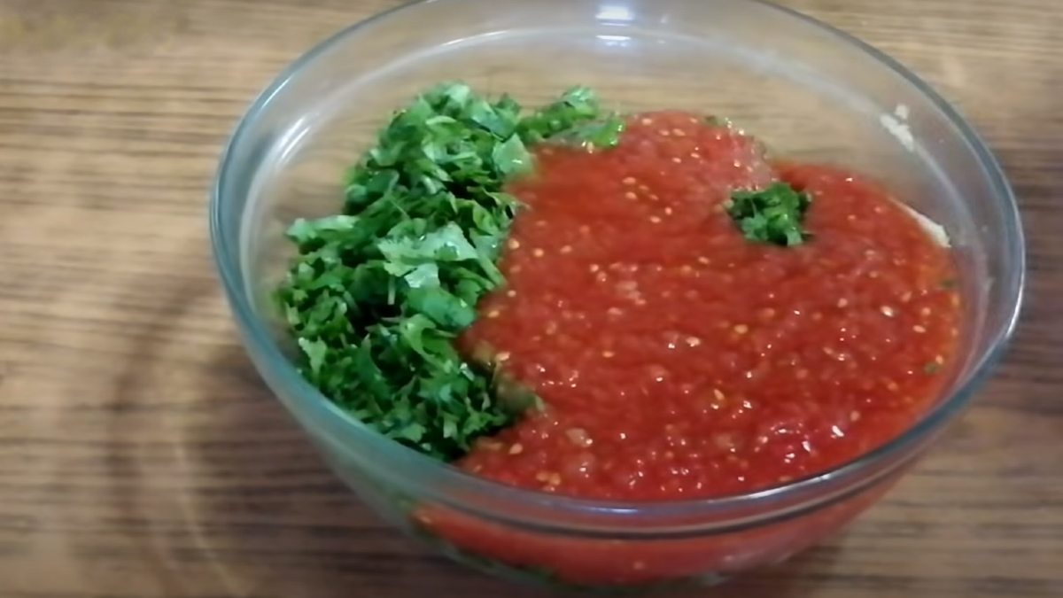 Wymieszaj zioła, jabłko i przeciśnięty przez praskę czosnek. Zmiel pomidory w maszynce do mięsa i również dodaj do miski.