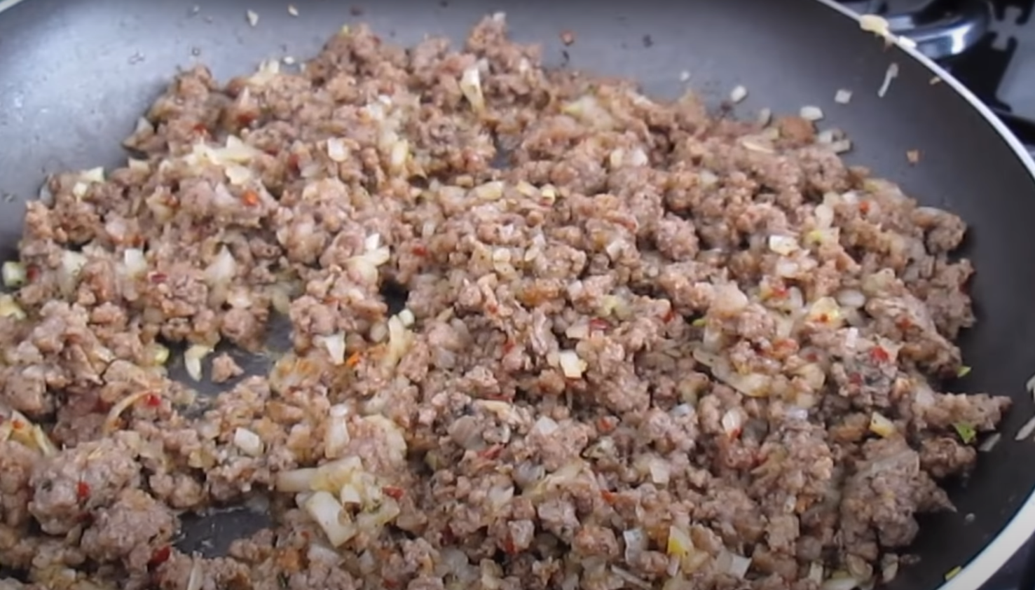 Możesz przygotować pizzę z dodatkami według własnego uznania, ja tym razem wybrałam wersję z mięsem mielonym. Na patelnię wlej olej, podgrzej i podsmaż mięso mielone. Dodaj drobno posiekaną cebulę, wymieszaj, dodaj mieloną paprykę, czarny pieprz, suszoną miętę, sól i ponownie dobrze wymieszaj.