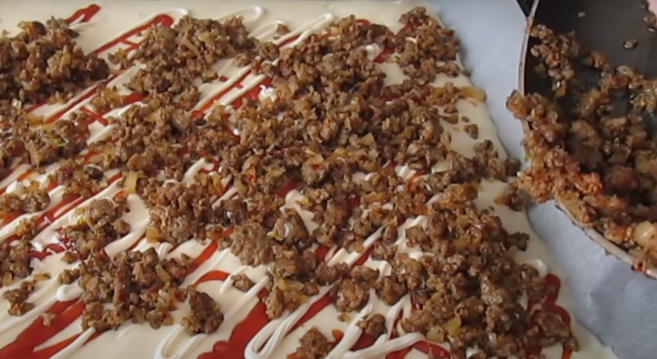Polej je keczupem lub sosem pomidorowym i ułóż mięso mielone. WSKAZÓWKA: Oprócz keczupu możesz też polać ciasto odrobiną majonezu.
